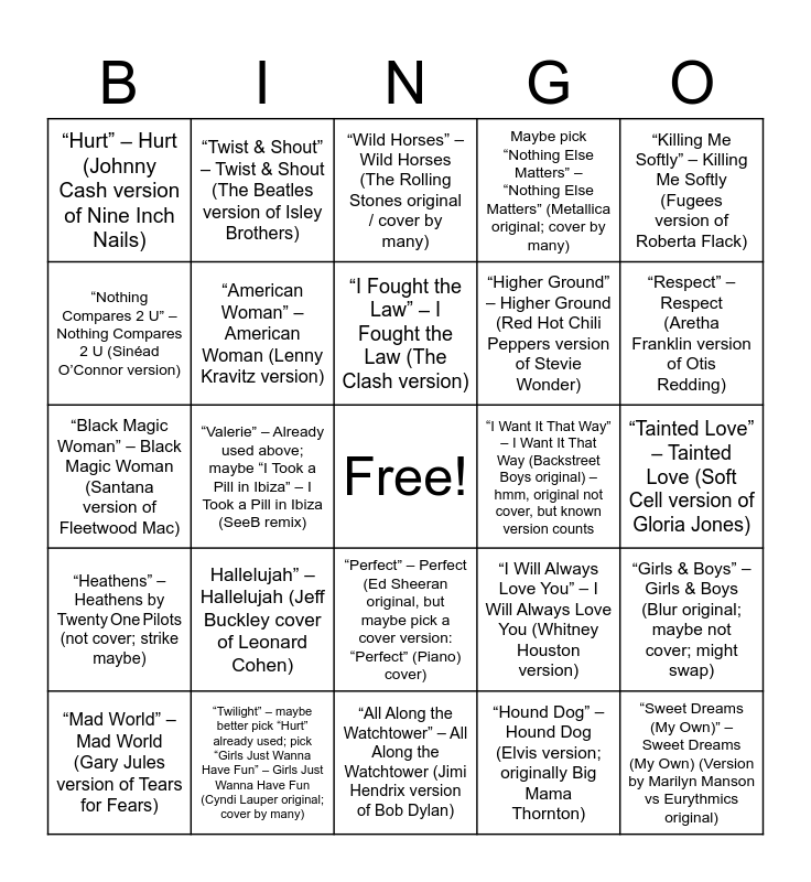 This bingo card has a free space and 25 words: Hallelujah” – Hallelujah (Jeff Buckley cover of Leonard Cohen), “All Along the Watchtower” – All Along the Watchtower (Jimi Hendrix version of Bob Dylan), “I Fought the Law” – I Fought the Law (The Clash version), “Mad World” – Mad World (Gary Jules version of Tears for Fears), “Killing Me Softly” – Killing Me Softly (Fugees version of Roberta Flack), “Hurt” – Hurt (Johnny Cash version of Nine Inch Nails), “Nothing Compares 2 U” – Nothing Compares 2 U (Sinéad O’Connor version), “Twist & Shout” – Twist & Shout (The Beatles version of Isley Brothers), “I Want It That Way” – I Want It That Way (Backstreet Boys original) – hmm, original not cover, but known version counts, “Perfect” – Perfect (Ed Sheeran original, but maybe pick a cover version: “Perfect” (Piano) cover), “Higher Ground” – Higher Ground (Red Hot Chili Peppers version of Stevie Wonder), “Black Magic Woman” – Black Magic Woman (Santana version of Fleetwood Mac), “I Will Always Love You” – I Will Always Love You (Whitney Houston version), “Girls & Boys” – Girls & Boys (Blur original; maybe not cover; might swap), “American Woman” – American Woman (Lenny Kravitz version), “Somewhere Over the Rainbow” – Somewhere Over the Rainbow (Israel “K” version cover), “Tainted Love” – Tainted Love (Soft Cell version of Gloria Jones), “Wild Horses” – Wild Horses (The Rolling Stones original / cover by many), “Respect” – Respect (Aretha Franklin version of Otis Redding), “Valerie” – Already used above; maybe “I Took a Pill in Ibiza” – I Took a Pill in Ibiza (SeeB remix), “Sweet Dreams (My Own)” – Sweet Dreams (My Own) (Version by Marilyn Manson vs Eurythmics original), “Twilight” – maybe better pick “Hurt” already used; pick “Girls Just Wanna Have Fun” – Girls Just Wanna Have Fun (Cyndi Lauper original; cover by many), “Heathens” – Heathens by Twenty One Pilots (not cover; strike maybe), Maybe pick “Nothing Else Matters” – “Nothing Else Matters” (Metallica original; cover by many) and “Hound Dog” – Hound Dog (Elvis version; originally Big Mama Thornton).