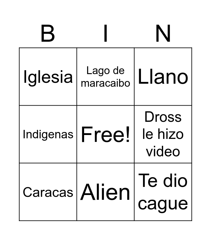 This bingo card has a free space and 9 words: Caracas, Llano, Lago de maracaibo, Indigenas, Iglesia, Dross le hizo video, Te dio cague, Hospital and Alien.