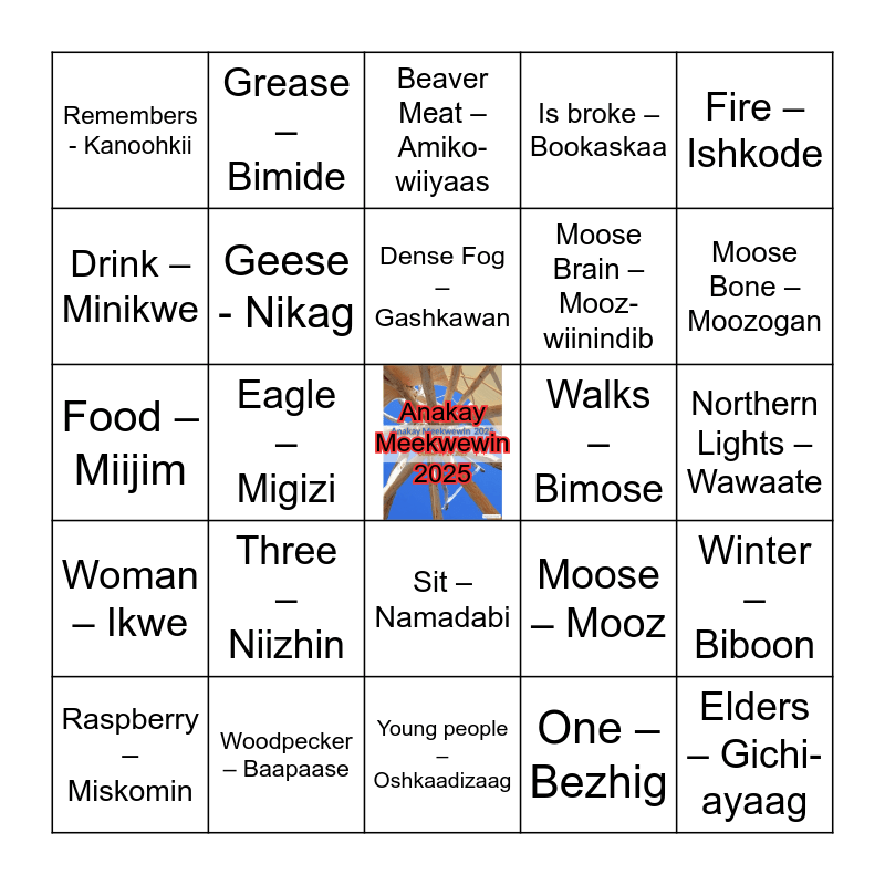 This bingo card has a free space and 77 words: Amazing – Maamakaaj, Beaver – Amik, Beaver Meat – Amiko-wiiyaas, Birchbark – Wiigwaas, Black – Makadewaa, Blue – Ozhawashkwaa, Blueberries – Miinan, Blueberry – Miin, Breathe – Bagidanaamo, Camp – Gabeshiwin, Children – Abinoojiinyag, Cold – Gisinaa, Dense Fog – Gashkawan, Drink – Minikwe, Ducks - Zhiishiibag, Eagle – Migizi, Eat – Wiisini, Elders – Gichi-ayaag, Fall – Dagwaagin, Fire – Ishkode, Fish – Giigoonh, Food – Miijim, Geese - Nikag, Grease – Bimide, Is broke – Bookaskaa, Kind – Gizhewaadizi, Knife – Mookomaan, Land / Earth – Aki, Laughs – Baapi, Listen – Bizindam, Love – Zaagi'idiwin, Man – Inini, Moon – Dibiki-giizis, Moose – Mooz, Moose Bone – Moozogan, Moose Brain – Mooz-wiinindib, Moose Meat - Moozo-wiiyaas, Moosehide – Moozwegin, Northern Lights – Wawaate, One – Bezhig, Orange – Misko-ozaawaa, Our Foods - Gimiijiminaan, Outside – Agwajiing, Pumpkin – Okosimaan, Rain – Gimiwan, Raspberries – Miskominag, Raspberry – Miskomin, Remembers - Kanoohkii, Runs – Bimibatoo, Scissors – Moozhwaagan, Scraper – Maada'igan, Sit – Namadabi, Sky – Giizhig, Soup – Naboob, Spring – Ziigwan, Strawberries – Ode’iminan, Strawberry – Ode‘imin, Summer – Niibin, Sun – Giizis, Thank you – Miigwech, Three – Niizhin, Tipi – Bajiishka'ogaan, Today – Noongom, Tomorrow – Waabang, Tree – Mitig, Truth – Debwe-win, Two – Niizhin, Walks – Bimose, Water – Nibi, Wild Rice – Manoomin, Wind – Noodin, Winter – Biboon, Woman – Ikwe, Woodpecker – Baapaase, Yellow – Ozaawaa, Young people – Oshkaadizaag and Zero – Waawiyebii-igan.