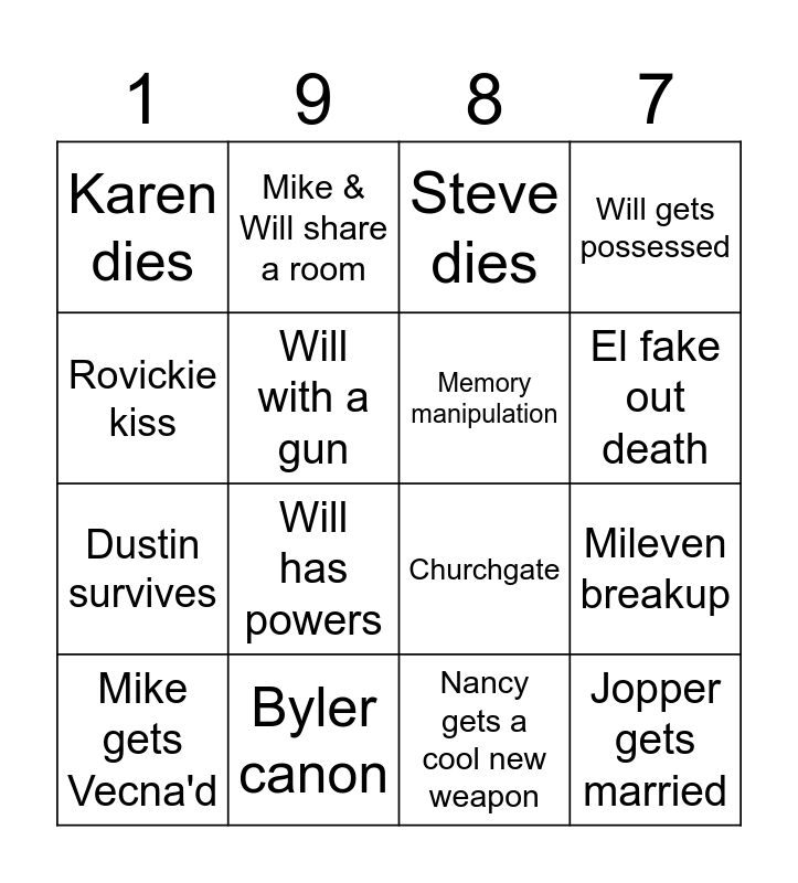 This bingo card has 16 words: Byler canon, Mileven breakup, Steve dies, Karen dies, Dustin survives, Mike & Will share a room, Churchgate, Nancy gets a cool new weapon, Rovickie kiss, Will with a gun, Mike gets Vecna'd, Will gets possessed, Will has powers, El fake out death, Memory manipulation and Jopper gets married.