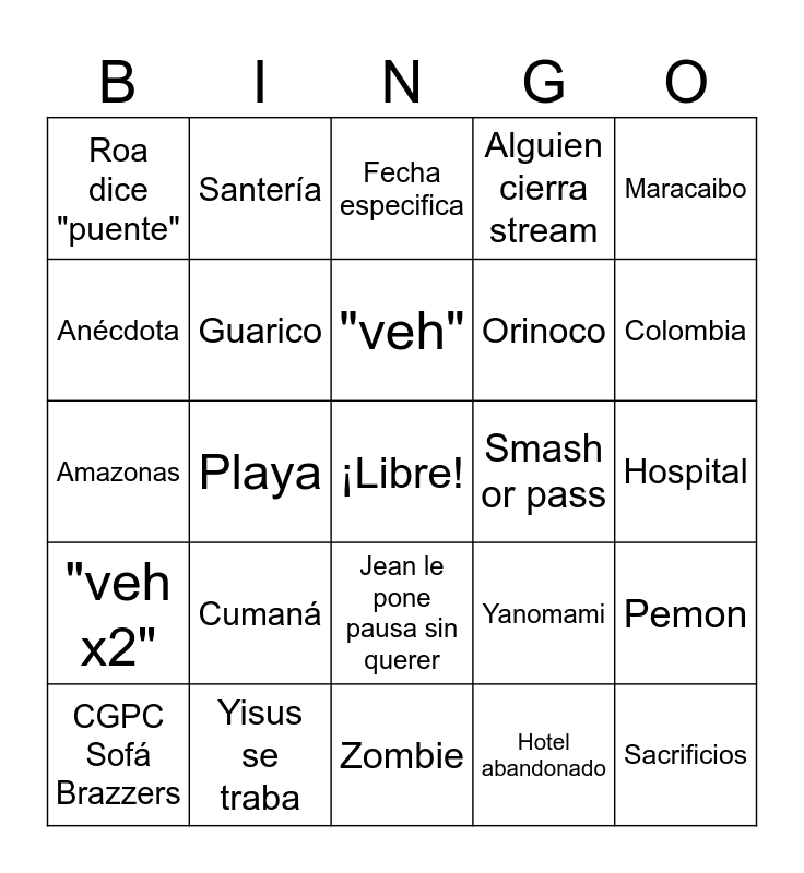 This bingo card has a free space and 24 words: Cumaná, Yisus se traba, "veh", CGPC Sofá Brazzers, Maracaibo, Roa dice "puente", Anécdota, Santería, Smash or pass, Jean le pone pausa sin querer, Orinoco, Amazonas, Yanomami, Pemon, Guarico, Hotel abandonado, Hospital, Fecha especifica, Colombia, Playa, Sacrificios, "veh x2", Alguien cierra stream and Zombie.