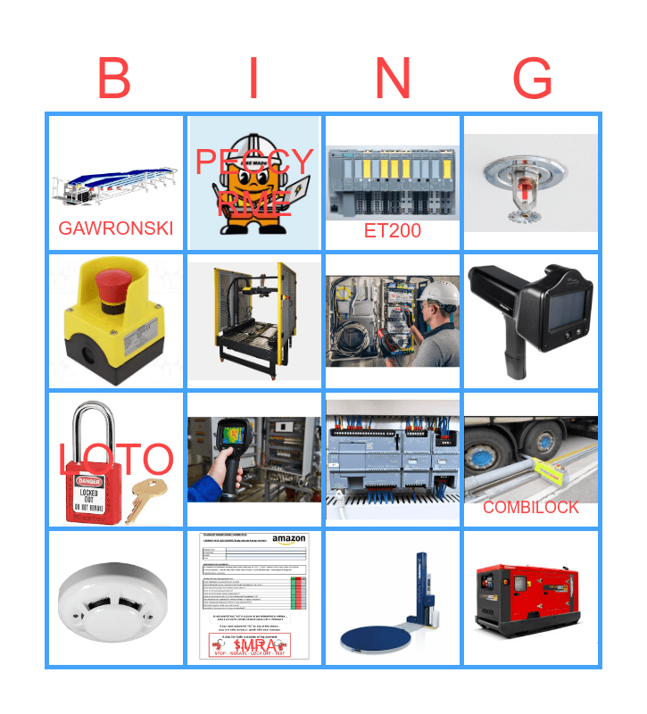 This bingo card has 16 images and 6 words: 1MRA, COMBILOCK, ET200, GAWRONSKI, LOTO and PECCY RME.