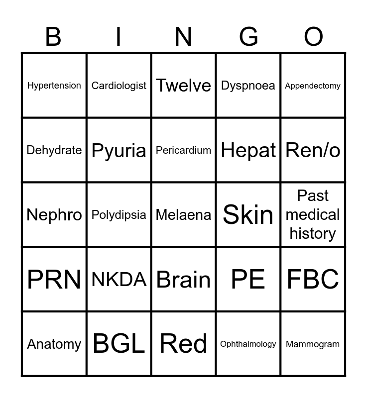 This bingo card has 71 words: Free!, Cardiologist, URTI, QLD, Red, Gyneco, Dyspnoea, Dysphagia, Hepat, ARF, Anatomy, itis, Ren/o, Hypertension, Three times daily, Nephro, PE, Appendectomy, Arteritis, Past medical history, NKDA, Melaena, FBC, Stomy, emesis, NSAIDS, bx, rect/o, intestines, Haemoglobin, BGL, GORD, Bucco, MS, Ophthalmology, Preoperative, Antibiotic, Endoscope, Dehydrate, Biology, Brain, Mammogram, PRN, Aphonia, Dactyl, Nephrology, Encephalitis, Pyuria, Spinal Cord, Cholecystectomy, IDC, Fracture, Skin, Cystic Fibrosis, Chest X-ray, Intercostal Catheter, Pericardium, Physiology, Distal, Hypercapnia, Dysplasia, Hypoxemia, Polydipsia, Finger/toe, Abduction, Adduction, Twelve, Enlargement, Surrounding, Dys and Suppository.