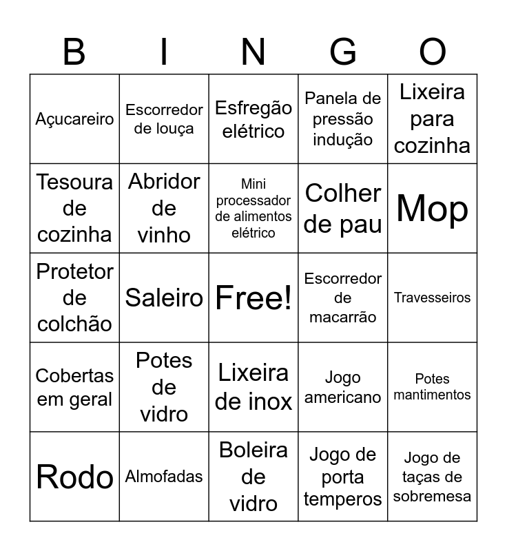 This bingo card has a free space and 51 words: Jogo de xícaras, Jogo de taças de sobremesa, Kit facas, Boleira de vidro, Potes de vidro, Tábua de cortar carne de vidro ou inox, Escorredor de louça, Porta talheres de gaveta, Tesoura de cozinha, Abridor de lata, Abridor de vinho, Panela de pressão indução, Potes mantimentos, Jogo americano, Trilho de mesa, Rodinho de pia, Mini processador de alimentos elétrico, Escorredor de macarrão, Espremedor de alho, Lixeira para cozinha, Saleiro, Jogo de porta temperos, Açucareiro, Colher de pau, Tapetinho antiderrapante para cozinha, Suporte de detergente e esponja, Mop, Prendedor de varal, Rodo, Esfregão elétrico, Potes porta sabão e amaciante, Escovinha de limpeza, Varal de chão, Tapete para sala, Cortina blackout para porta janela, Almofadas, Porta-chaves, Mantinha para sofá, Abajur ou luminária de canto, Jogo de lençol, Travesseiros, Cobertas em geral, Jogo de cobre-leito, Toalhas de banho, Toalhas de rosto, Kit de cabides, Protetor de colchão, Kit tapetinhos de banheiro, Kit porta sabonete e escovas para pia do banheiro, Lixeira de inox and Escova sanitária.
