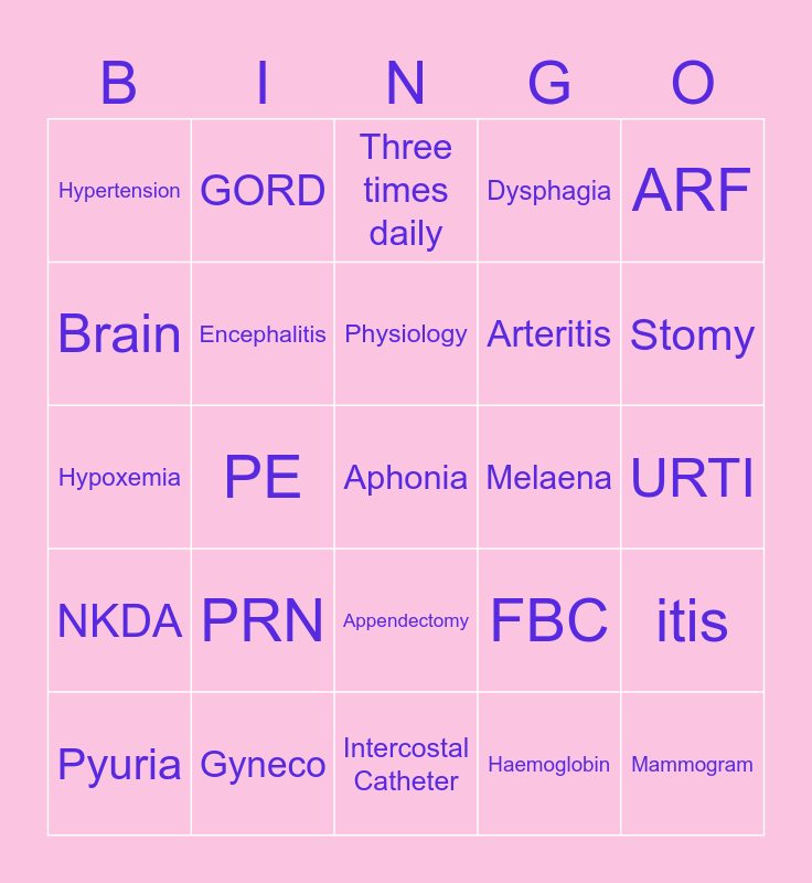 This bingo card has 70 words: Cardiologist, URTI, QLD, Red, Gyneco, Dyspnoea, Dysphagia, Hepat, ARF, Anatomy, itis, Ren/o, Hypertension, Three times daily, Nephro, PE, Appendectomy, Arteritis, Past medical history, NKDA, Melaena, FBC, Stomy, emesis, NSAIDS, bx, rect/o, intestines, Haemoglobin, BGL, GORD, Bucco, MS, Ophthalmology, Preoperative, Antibiotic, Endoscope, Dehydrate, Biology, Brain, Mammogram, PRN, Aphonia, Dactyl, Nephrology, Encephalitis, Pyuria, Spinal Cord, Cholecystectomy, IDC, Fracture, Skin, Cystic Fibrosis, Chest X-ray, Intercostal Catheter, Pericardium, Physiology, Distal, Hypercapnia, Dysplasia, Hypoxemia, Polydipsia, Finger/toe, Abduction, Adduction, Twelve, Enlargement, Surrounding, Dys and Suppository.