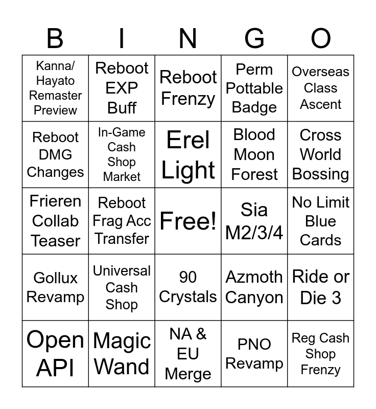 This bingo card has a free space and 24 words: Universal Cash Shop, Magic Wand, Erel Light, Open API, Overseas Class Ascent, Kanna/ Hayato Remaster Preview, Reboot DMG Changes, Reboot EXP Buff, Sia M2/3/4, 90 Crystals, Blood Moon Forest, Frieren Collab Teaser, Azmoth Canyon, Ride or Die 3, In-Game Cash Shop Market, PNO Revamp, No Limit Blue Cards, Reboot Frenzy, Cross World Bossing, Reboot Frag Acc Transfer, Reg Cash Shop Frenzy, Gollux Revamp, Perm Pottable Badge and NA & EU Merge.