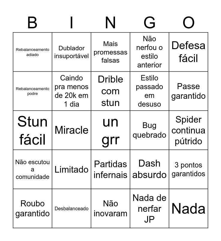 This bingo card has a free space and 24 words: Limitado, Desbalanceado, Drible com stun, Roubo garantido, Defesa fácil, Rebalanceamento adiado, Rebalanceamento podre, Dublador insuportável, Bug quebrado, Partidas infernais, Estilo passado em desuso, Stun fácil, Dash absurdo, 3 pontos garantidos, Caindo pra menos de 20k em 1 dia, Nada de nerfar JP, Spider continua pútrido, Mais promessas falsas, Passe garantido, Miracle, Nada, Não escutou a comunidade, Não nerfou o estilo anterior and Não inovaram.
