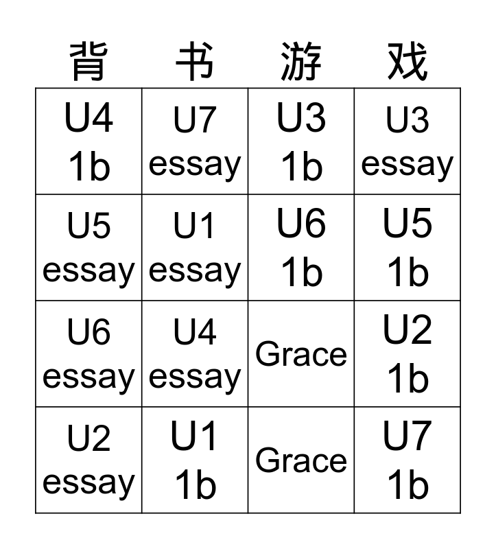 This bingo card has 16 words: U1 1b, U2 1b, U3 1b, U4 1b, U6 essay, U7 essay, Grace, Grace, U5 essay, U1 essay, U2 essay, U3 essay, U4 essay, U5 1b, U6 1b and U7 1b.