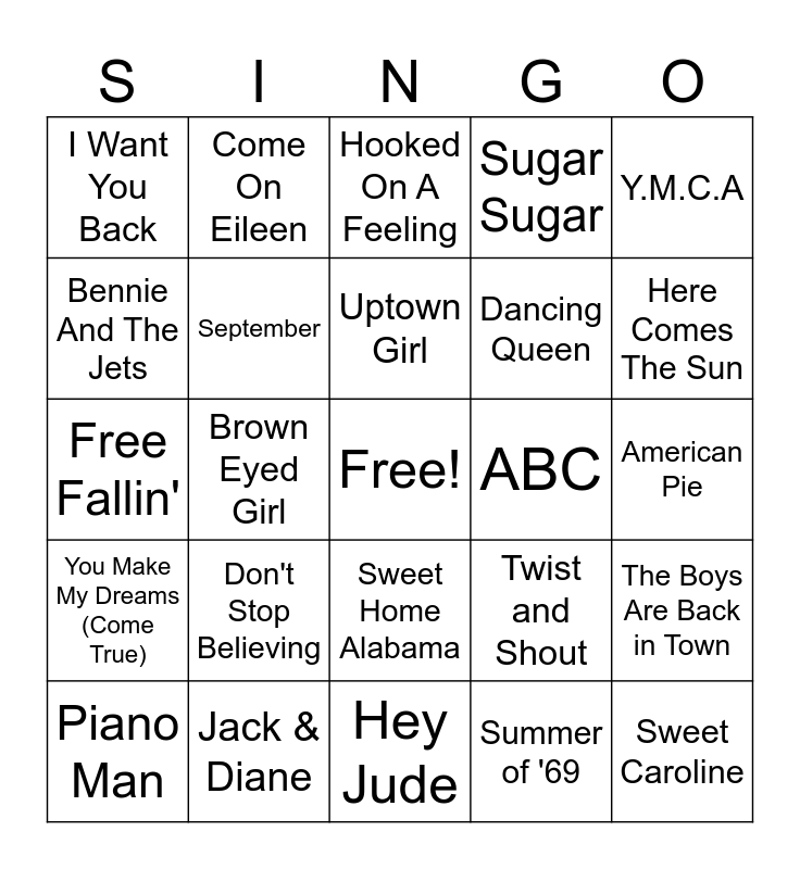 This bingo card has a free space and 24 words: Don't Stop Believing, Jack & Diane, Uptown Girl, Piano Man, Y.M.C.A, I Want You Back, Bennie And The Jets, Come On Eileen, ABC, Sweet Home Alabama, Dancing Queen, Free Fallin', Twist and Shout, The Boys Are Back in Town, September, Summer of '69, American Pie, Hooked On A Feeling, Here Comes The Sun, Brown Eyed Girl, Sweet Caroline, You Make My Dreams (Come True), Sugar Sugar and Hey Jude.