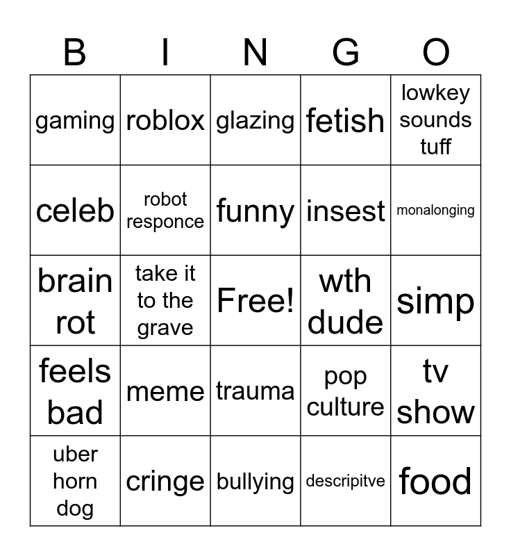 This bingo card has a free space and 24 words: meme, cringe, funny, uber horn dog, lowkey sounds tuff, gaming, celeb, roblox, wth dude, trauma, insest, brain rot, pop culture, tv show, robot responce, descripitve, simp, glazing, monalonging, take it to the grave, food, feels bad, fetish and bullying.