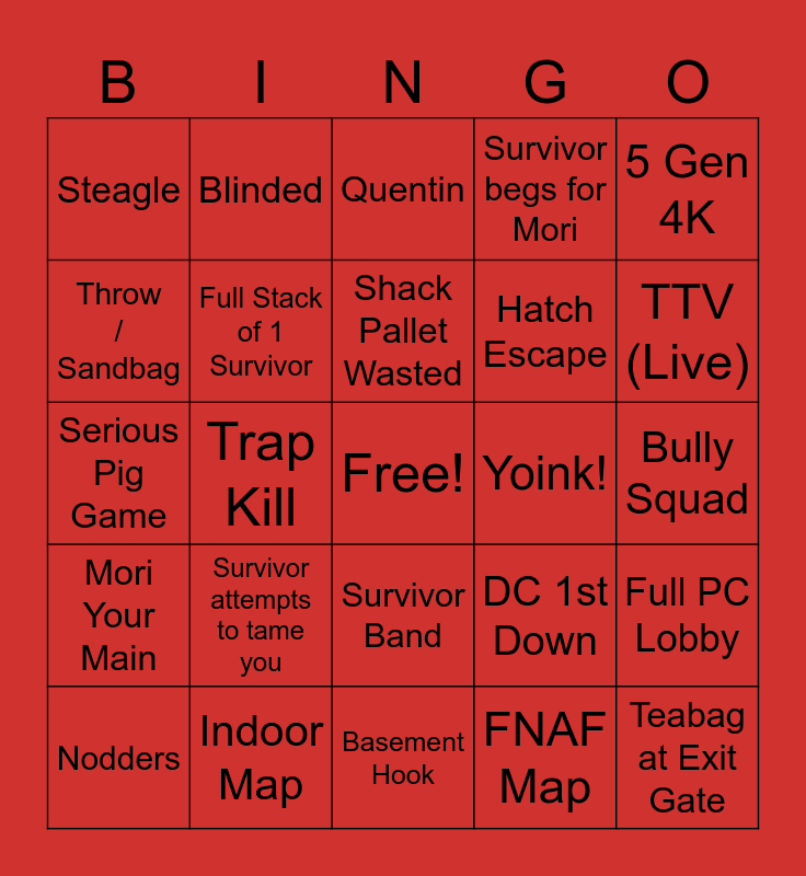 This bingo card has a free space and 24 words: Survivor attempts to tame you, Indoor Map, Shack Pallet Wasted, Nodders, 5 Gen 4K, Steagle, Throw / Sandbag, Blinded, Yoink!, Survivor Band, Hatch Escape, Serious Pig Game, DC 1st Down, Full PC Lobby, Full Stack of 1 Survivor, FNAF Map, Bully Squad, Quentin, TTV (Live), Trap Kill, Teabag at Exit Gate, Mori Your Main, Survivor begs for Mori and Basement Hook.