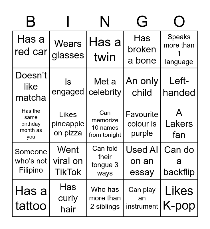 This bingo card has a free space and 24 words: Went viral on TikTok, Has curly hair, Met a celebrity, Has a tattoo, Speaks more than 1 language, Has a red car, Doesn’t like matcha, Wears glasses, Favourite colour is purple, Can fold their tongue 3 ways, An only child, Has the same birthday month as you, Used AI on an essay, Can do a backflip, Is engaged, Can play an instrument, A Lakers fan, Has a twin, Left-handed, Likes pineapple on pizza, Likes K-pop, Someone who’s not Filipino, Has broken a bone and Who has more than 2 siblings.