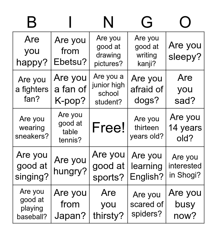 This bingo card has a free space and 24 words: Are you hungry?, Are you from Japan?, Are you a junior high school student?, Are you good at playing baseball?, Are you sleepy?, Are you happy?, Are you a fighters fan?, Are you from Ebetsu?, Are you thirteen years old?, Are you good at sports?, Are you afraid of dogs?, Are you wearing sneakers?, Are you learning English?, Are you interested in Shogi?, Are you a fan of K-pop?, Are you scared of spiders?, Are you 14 years old?, Are you good at drawing pictures?, Are you sad?, Are you good at table tennis?, Are you busy now?, Are you good at singing?, Are you good at writing kanji? and Are you thirsty?.