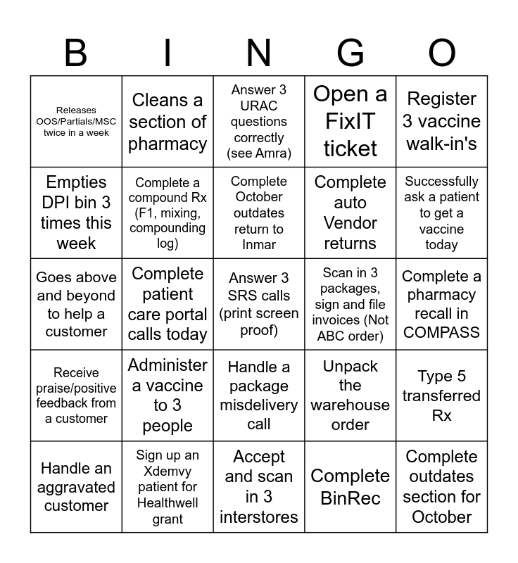 This bingo card has 25 words: Administer a vaccine to 3 people, Accept and scan in 3 interstores, Complete October outdates return to Inmar, Handle an aggravated customer, Register 3 vaccine walk-in's, Releases OOS/Partials/MSC twice in a week, Empties DPI bin 3 times this week, Cleans a section of pharmacy, Scan in 3 packages, sign and file invoices (Not ABC order), Handle a package misdelivery call, Complete auto Vendor returns, Goes above and beyond to help a customer, Unpack the warehouse order, Type 5 transferred Rx, Complete a compound Rx (F1, mixing, compounding log), Complete outdates section for October, Complete a pharmacy recall in COMPASS, Answer 3 URAC questions correctly (see Amra), Successfully ask a patient to get a vaccine today, Complete patient care portal calls today, Answer 3 SRS calls (print screen proof), Sign up an Xdemvy patient for Healthwell grant, Receive praise/positive feedback from a customer, Open a FixIT ticket and Complete BinRec.
