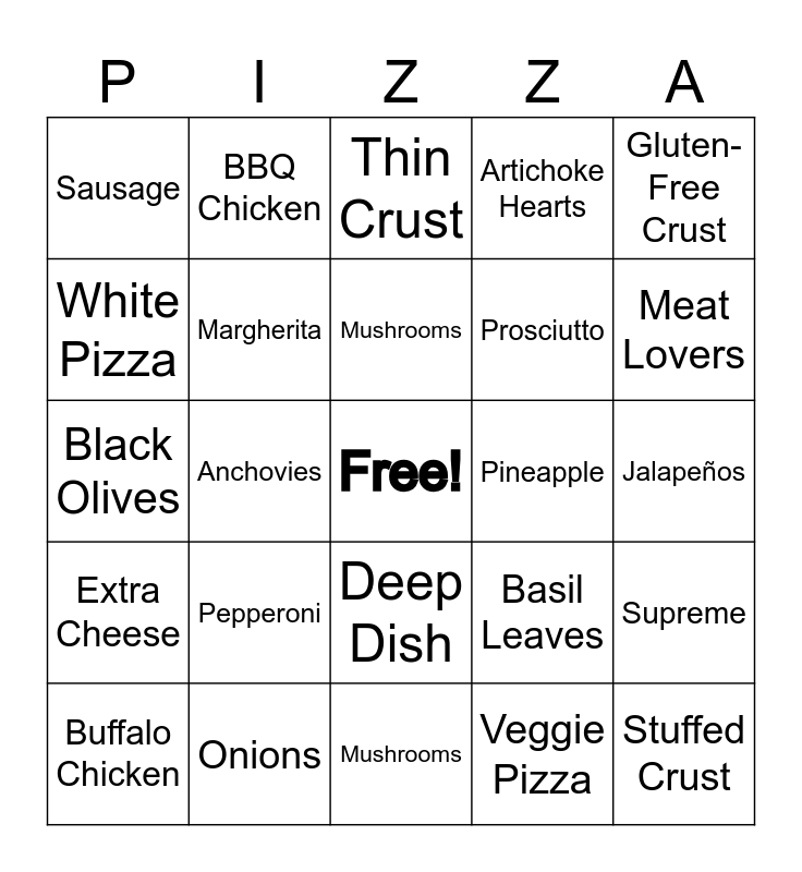 This bingo card has a free space and 24 words: Pepperoni, Onions, Mushrooms, Buffalo Chicken, Gluten-Free Crust, Sausage, White Pizza, BBQ Chicken, Pineapple, Deep Dish, Prosciutto, Black Olives, Basil Leaves, Supreme, Margherita, Veggie Pizza, Jalapeños, Thin Crust, Meat Lovers, Anchovies, Stuffed Crust, Extra Cheese, Artichoke Hearts and Mushrooms.