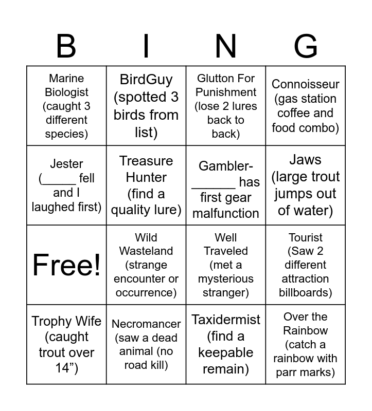 This bingo card has 20 words: Tourist (Saw 2 different attraction billboards), One and Done (caught a fish on a lure then lost it after), Glutton For Punishment (lose 2 lures back to back), Bad Step (socks got wet ), Trophy Wife (caught trout over 14”), Jester (_____ fell and I laughed first), Necromancer (saw a dead animal (no road kill), Marine Biologist (caught 3 different species), Free!, BirdGuy (spotted 3 birds from list), Wild Wasteland (strange encounter or occurrence), Well Traveled (met a mysterious stranger), Treasure Hunter (find a quality lure), Over the Rainbow (catch a rainbow with parr marks), Gambler- ______ has first gear malfunction, Geologist (find an agate), Jaws (large trout jumps out of water), Connoisseur (gas station coffee and food combo), Taxidermist (find a keepable remain) and Country mama (eat at a diner).