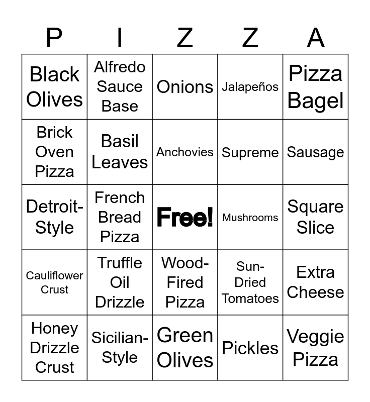 This bingo card has a free space and 24 words: Truffle Oil Drizzle, Sicilian-Style, Anchovies, Honey Drizzle Crust, Pizza Bagel, Black Olives, Brick Oven Pizza, Alfredo Sauce Base, Mushrooms, Wood-Fired Pizza, Supreme, Detroit-Style, Sun-Dried Tomatoes, Extra Cheese, Basil Leaves, Pickles, Square Slice, Onions, Sausage, French Bread Pizza, Veggie Pizza, Cauliflower Crust, Jalapeños and Green Olives.