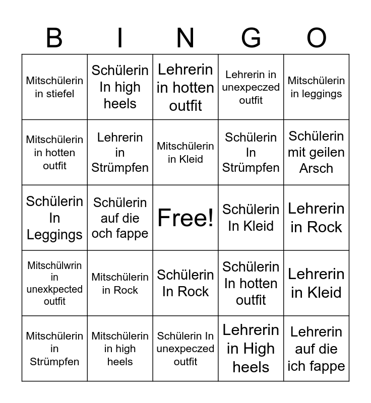 This bingo card has a free space and 24 words: Mitschülerin in Rock, Mitschülerin in high heels, Mitschülerin in Kleid, Mitschülerin in Strümpfen, Mitschülerin in leggings, Mitschülerin in stiefel, Mitschülerin in hotten outfit, Schülerin In high heels, Schülerin In Kleid, Schülerin In Rock, Schülerin In Strümpfen, Schülerin In Leggings, Schülerin In hotten outfit, Lehrerin in Kleid, Lehrerin in Strümpfen, Lehrerin in High heels, Lehrerin in Rock, Lehrerin in hotten outfit, Schülerin mit geilen Arsch, Schülerin auf die och fappe, Lehrerin auf die ich fappe, Mitschülwrin in unexkpected outfit, Lehrerin in unexpeczed outfit and Schülerin In unexpeczed outfit.