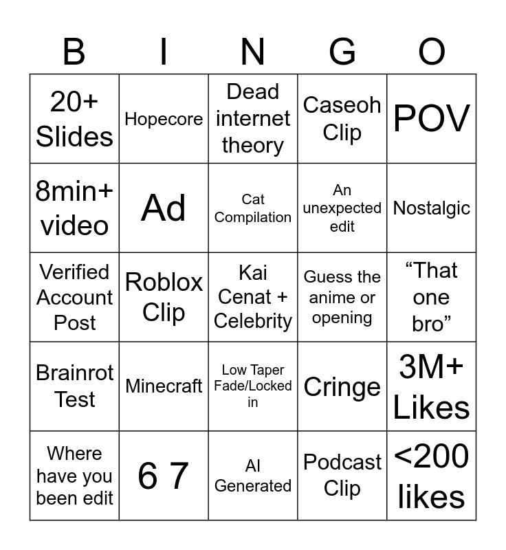 This bingo card has a free space and 24 words: Minecraft, 6 7, Cat Compilation, Where have you been edit, POV, 20+ Slides, 8min+ video, Hopecore, Guess the anime or opening, Low Taper Fade/Locked in, An unexpected edit, Verified Account Post, Cringe, 3M+ Likes, Ad, Podcast Clip, “That one bro”, Dead internet theory, Nostalgic, Roblox Clip, <200 likes, Brainrot Test, Caseoh Clip and AI Generated.