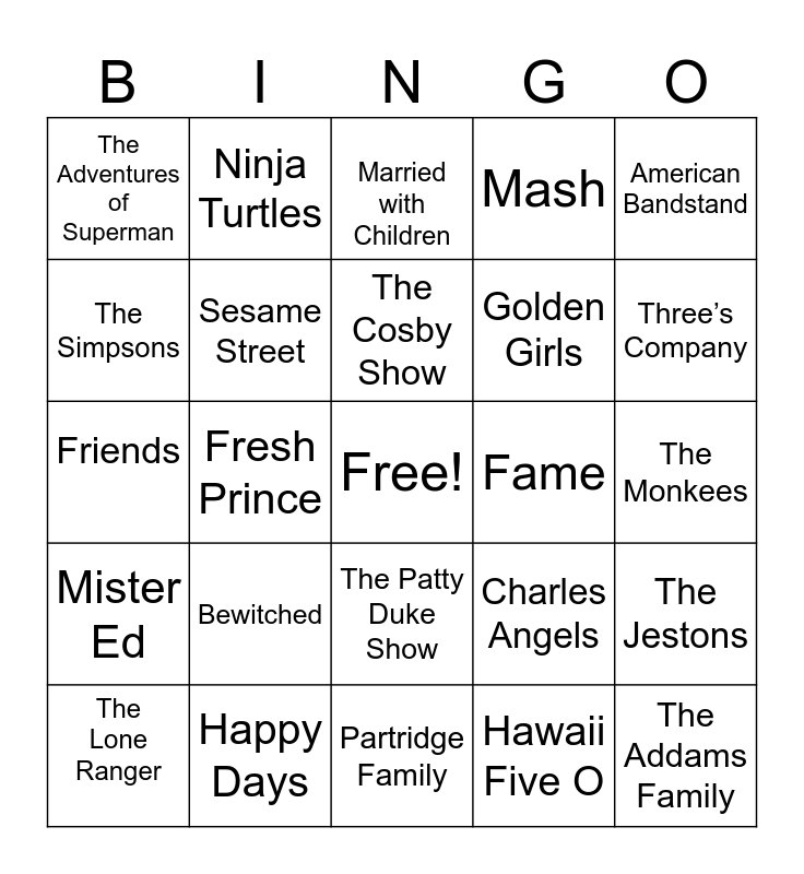 This bingo card has a free space and 24 words: Bewitched, Happy Days, The Cosby Show, The Lone Ranger, American Bandstand, The Adventures of Superman, The Simpsons, Ninja Turtles, Fame, The Patty Duke Show, Golden Girls, Friends, Charles Angels, The Jestons, Sesame Street, Hawaii Five O, The Monkees, Married with Children, Three’s Company, Fresh Prince, The Addams Family, Mister Ed, Mash and Partridge Family.
