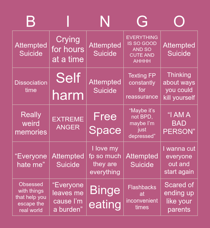 This bingo card has a free space and 34 words: Attempted Suicide, Extreme fear of abandonment, Has 50 different emotions a day, Can never keep friendships, “I AM A BAD PERSON”, Dissociation time, Self harm, Binge eating, Texting FP constantly for reassurance, Scared of ending up like your parents, Really weird memories, Crying for hours at a time, Flashbacks at inconvenient times, Can’t sleep without meds, “Everyone hate me”, EXTREME ANGER, I love my fp so much they are everything, “Maybe it’s not BPD, maybe I’m just depressed”, I wanna cut everyone out and start again, Obsessed with things that help you escape the real world, “Everyone leaves me cause I’m a burden”, What if things never get better because life is meaningless?, EVERYTHING IS SO GOOD AND SO CUTE AND AHHHH, Thinking about ways you could kill yourself, Attempted Suicide, Attempted Suicide, Attempted Suicide, Attempted Suicide, Attempted Suicide, Attempted Suicide, Attempted Suicide, Attempted Suicide, Attempted Suicide and Attempted Suicide.