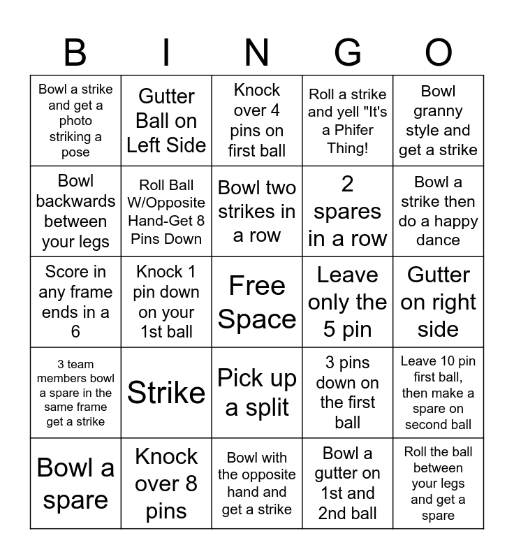 This bingo card has a free space and 24 words: Strike, Knock over 8 pins, Bowl two strikes in a row, Bowl a spare, Bowl granny style and get a strike, Bowl a strike and get a photo striking a pose, Bowl backwards between your legs, Gutter Ball on Left Side, Leave only the 5 pin, Pick up a split, 2 spares in a row, Score in any frame ends in a 6, 3 pins down on the first ball, Leave 10 pin first ball, then make a spare on second ball, Roll Ball W/Opposite Hand-Get 8 Pins Down, Bowl a gutter on 1st and 2nd ball, Gutter on right side, Knock over 4 pins on first ball, Bowl a strike then do a happy dance, Knock 1 pin down on your 1st ball, Roll the ball between your legs and get a spare, 3 team members bowl a spare in the same frame get a strike, Roll a strike and yell "It's a Phifer Thing! and Bowl with the opposite hand and get a strike.