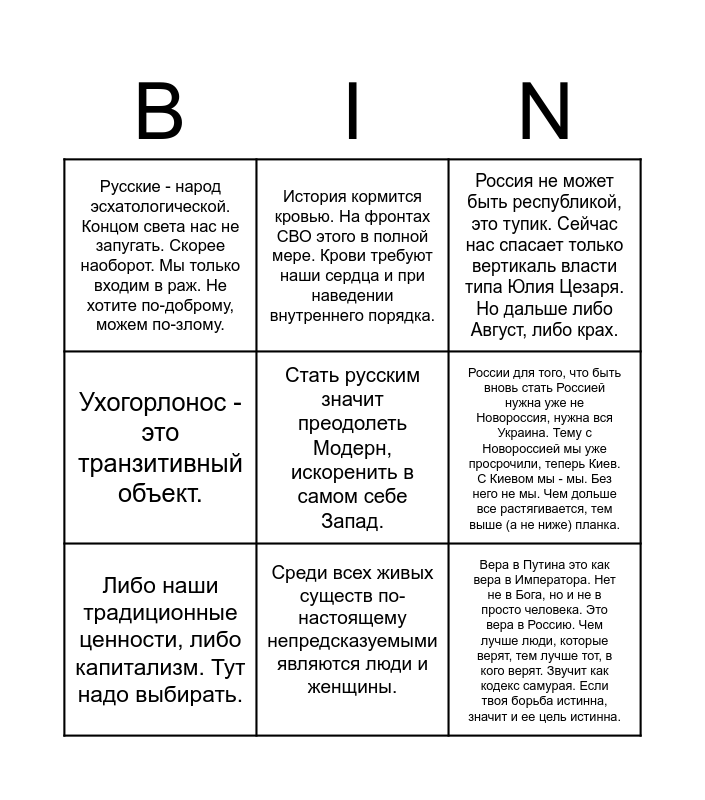 This bingo card has a free space and 8 words: России для того, что быть вновь стать Россией нужна уже не Новороссия, нужна вся Украина. Тему с Новороссией мы уже просрочили, теперь Киев. С Киевом мы - мы. Без него не мы. Чем дольше все растягивается, тем выше (а не ниже) планка., Россия не может быть республикой, это тупик. Сейчас нас спасает только вертикаль власти типа Юлия Цезаря. Но дальше либо Август, либо крах., История кормится кровью. На фронтах СВО этого в полной мере. Крови требуют наши сердца и при наведении внутреннего порядка., Либо наши традиционные ценности, либо капитализм. Тут надо выбирать., Русские - народ эсхатологической. Концом света нас не запугать. Скорее наоборот. Мы только входим в раж. Не хотите по-доброму, можем по-злому., Вера в Путина это как вера в Императора. Нет не в Бога, но и не в просто человека. Это вера в Россию. Чем лучше люди, которые верят, тем лучше тот, в кого верят. Звучит как кодекс самурая. Если твоя борьба истинна, значит и ее цель истинна., Ухогорлонос - это транзитивный объект. and Среди всех живых существ по-настоящему непредсказуемыми являются люди и женщины..