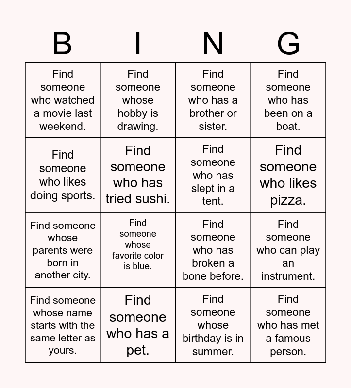 This bingo card has 16 words: Find someone who has a pet., Find someone who can play an instrument., Find someone who has a brother or sister., Find someone who watched a movie last weekend., Find someone whose parents were born in another city., Find someone whose hobby is drawing., Find someone who has broken a bone before., Find someone whose birthday is in summer., Find someone who likes doing sports., Find someone who has tried sushi., Find someone whose name starts with the same letter as yours., Find someone who has been on a boat., Find someone whose favorite color is blue., Find someone who likes pizza., Find someone who has slept in a tent. and Find someone who has met a famous person..