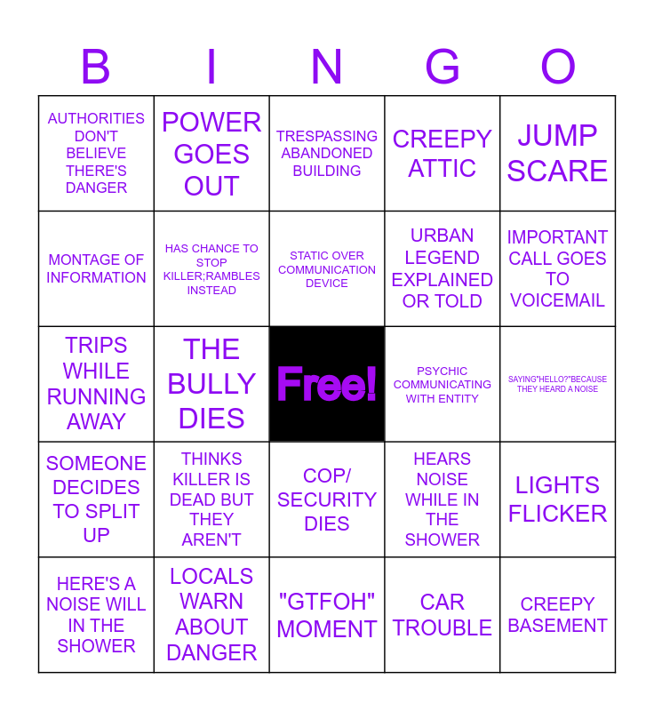 This bingo card has a free space and 32 words: CAR TROUBLE, COUPLE DIES WHILE HOOKING UP, THE BULLY DIES, PHONE PROBLEMS, SOMEONE DECIDES TO SPLIT UP, HAS CHANCE TO STOP KILLER;RAMBLES INSTEAD, JUMP SCARE, LIGHTS FLICKER, POWER GOES OUT, LOW BATTERY, STATIC OVER COMMUNICATION DEVICE, TRESPASSING ABANDONED BUILDING, HIDING IN THE CLOSET, NIGHTMARE, PSYCHIC COMMUNICATING WITH ENTITY, SRANGER KNOCKS ON DOOR, HERE'S A NOISE WILL IN THE SHOWER, TRIPS WHILE RUNNING AWAY, COP/ SECURITY DIES, THINKS KILLER IS DEAD BUT THEY AREN'T, HEARS NOISE WHILE IN THE SHOWER, IMAGINARY FRIEND GETS CHILD IN TROUBLE, SAYING"HELLO?"BECAUSE THEY HEARD A NOISE, LOCALS WARN ABOUT DANGER, CREEPY BASEMENT, CREEPY ATTIC, URBAN LEGEND EXPLAINED OR TOLD, MONTAGE OF INFORMATION, AUTHORITIES DON'T BELIEVE THERE'S DANGER, "GTFOH" MOMENT, WORDS WRITTEN ON MIRROR and IMPORTANT CALL GOES TO VOICEMAIL.