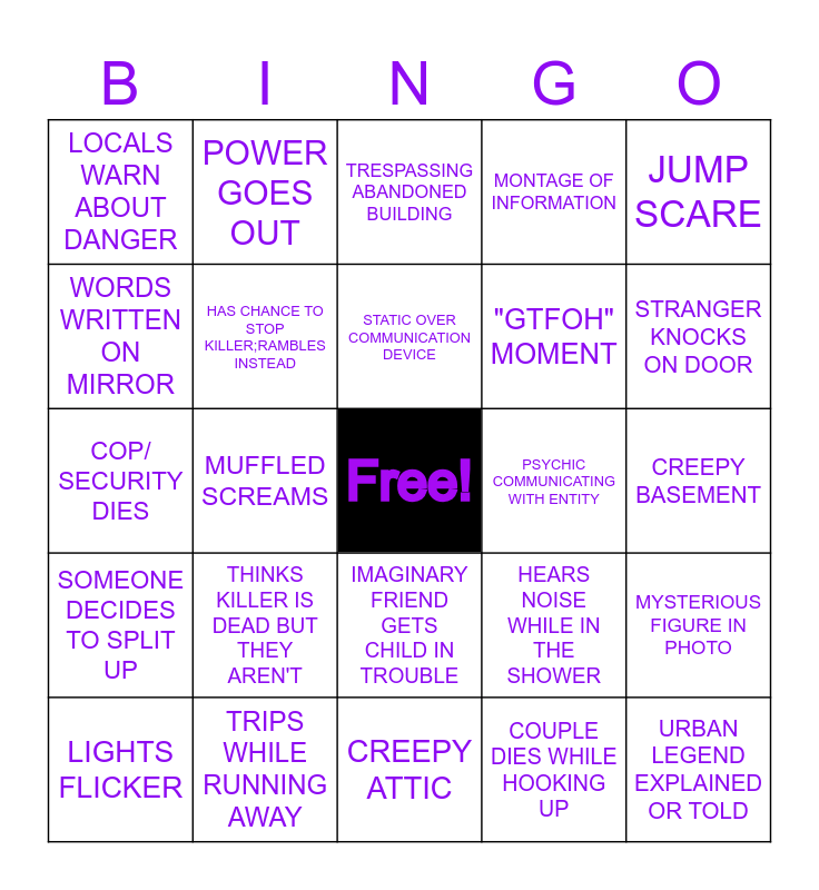 This bingo card has a free space and 34 words: CAR TROUBLE, COUPLE DIES WHILE HOOKING UP, THE BULLY DIES, PHONE PROBLEMS, SOMEONE DECIDES TO SPLIT UP, HAS CHANCE TO STOP KILLER;RAMBLES INSTEAD, JUMP SCARE, LIGHTS FLICKER, POWER GOES OUT, LOW BATTERY, STATIC OVER COMMUNICATION DEVICE, TRESPASSING ABANDONED BUILDING, HIDING IN THE CLOSET, NIGHTMARE, PSYCHIC COMMUNICATING WITH ENTITY, STRANGER KNOCKS ON DOOR, TRIPS WHILE RUNNING AWAY, COP/ SECURITY DIES, THINKS KILLER IS DEAD BUT THEY AREN'T, HEARS NOISE WHILE IN THE SHOWER, IMAGINARY FRIEND GETS CHILD IN TROUBLE, SAYING"HELLO?"BECAUSE THEY HEARD A NOISE, LOCALS WARN ABOUT DANGER, CREEPY BASEMENT, CREEPY ATTIC, URBAN LEGEND EXPLAINED OR TOLD, MONTAGE OF INFORMATION, AUTHORITIES DON'T BELIEVE THERE'S DANGER, "GTFOH" MOMENT, WORDS WRITTEN ON MIRROR, IMPORTANT CALL GOES TO VOICEMAIL, MUFFLED SCREAMS, MYSTERIOUS FIGURE IN PHOTO and STORMY GLOOMY WEATHER.