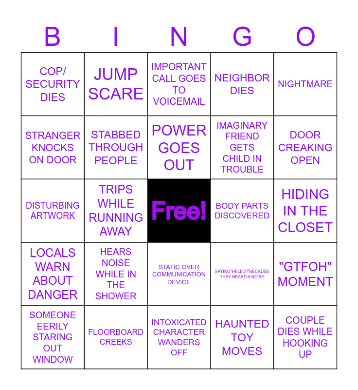 This bingo card has a free space and 68 words: CAR TROUBLE, COUPLE DIES WHILE HOOKING UP, THE BULLY DIES, PHONE PROBLEMS, SOMEONE DECIDES TO SPLIT UP, HAS CHANCE TO STOP KILLER;RAMBLES INSTEAD, JUMP SCARE, LIGHTS FLICKER, POWER GOES OUT, LOW BATTERY, STATIC OVER COMMUNICATION DEVICE, TRESPASSING ABANDONED BUILDING, HIDING IN THE CLOSET, NIGHTMARE, PSYCHIC COMMUNICATING WITH ENTITY, STRANGER KNOCKS ON DOOR, TRIPS WHILE RUNNING AWAY, COP/ SECURITY DIES, THINKS KILLER IS DEAD BUT THEY AREN'T, HEARS NOISE WHILE IN THE SHOWER, IMAGINARY FRIEND GETS CHILD IN TROUBLE, SAYING"HELLO?"BECAUSE THEY HEARD A NOISE, LOCALS WARN ABOUT DANGER, CREEPY BASEMENT, CREEPY ATTIC, URBAN LEGEND EXPLAINED OR TOLD, MONTAGE OF INFORMATION, AUTHORITIES DON'T BELIEVE THERE'S DANGER, "GTFOH" MOMENT, WORDS WRITTEN ON MIRROR, IMPORTANT CALL GOES TO VOICEMAIL, MUFFLED SCREAMS, MYSTERIOUS FIGURE IN PHOTO, STORMY GLOOMY WEATHER, NEIGHBOR DIES, WEIRD GLANCES & STARES FROM THE LOCALS, MOVES INTO OLD HOUSE, SOMEONE EERILY STARING OUT WINDOW, DOOR CREAKING OPEN, DISTURBING ARTWORK, LURKING BEHIND THE DOOR, INNOCENT PERSON FRAMED/ BLAMED, STABBED THROUGH PEOPLE, HIDING UNDER WATER FROM KILLER, SOMEONE GETS DRUGGED, HIDDEN ROOM DISCOVERED, EERIE GHOST LAUGHTER & RUNNING, KILLER HIDING IN BODY OF WATER, BODY PARTS DISCOVERED, FLOORBOARD CREEKS, NOT GRABBING WEAPON WHEN NEEDED, RUNNING INTO A DEAD END, BANGS ON WINDOW FOR ATTENTION OR HELP, INTOXICATED CHARACTER WANDERS OFF, OLD PHOTOS DISCOVERED, OLD VIDEOS WATCHED, HAUNTED TOY MOVES, LOOKS ALIVE BUT IS ACTUALLY DEAD, HI PITCH TO SCREAM, CAUGHT IN A TRAP OF SOME SORT, BLOOD DROPS, FALSELY ACCUSED OF INSANITY, SCREAMS MASKED BY LOUD MUSIC/ CELEBRATING, TRICKING THE KILLER, LIFE-OR-DEATH TIME LIMIT., SHINING A LIGHT INTO A DARK AREA, CLASSIC MUSIC OR OLDIES PLAYING DURING A GRUESOME SCENE and ANIMALS ACTING STRANGE.