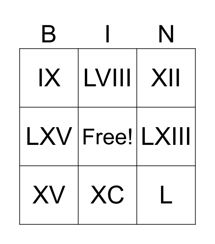 This bingo card has a free space and 30 words: I, III, V, VII, IX, XII, XV, XVIII, XX, XXIII, XXV, XXVIII, XXX, XXXIII, XXXV, XL, XLII, XLV, XLVIII, L, LIII, LV, LVIII, LX, LXIII, LXV, LXX, LXXV, XC and C.