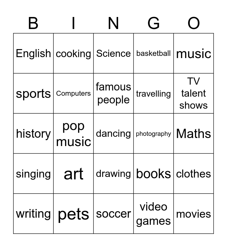 This bingo card has a free space and 24 words: art, pets, famous people, writing, music, English, sports, cooking, photography, drawing, travelling, history, books, clothes, Computers, video games, Maths, Science, TV talent shows, pop music, movies, singing, basketball and soccer.