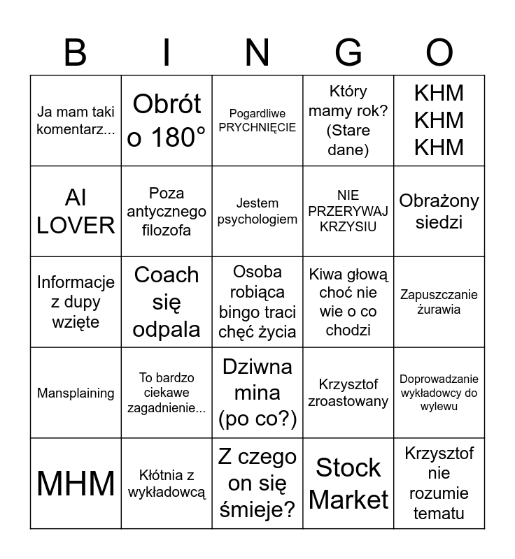 This bingo card has a free space and 24 words: MHM, To bardzo ciekawe zagadnienie..., Jestem psychologiem, Stock Market, KHM KHM KHM, Ja mam taki komentarz..., Obrót o 180°, Pogardliwe PRYCHNIĘCIE, Kiwa głową choć nie wie o co chodzi, Zapuszczanie żurawia, Informacje z dupy wzięte, Poza antycznego filozofa, Krzysztof zroastowany, Doprowadzanie wykładowcy do wylewu, AI LOVER, Kłótnia z wykładowcą, Z czego on się śmieje?, Który mamy rok? (Stare dane), Obrażony siedzi, Mansplaining, Coach się odpala, Dziwna mina (po co?), NIE PRZERYWAJ KRZYSIU and Krzysztof nie rozumie tematu.