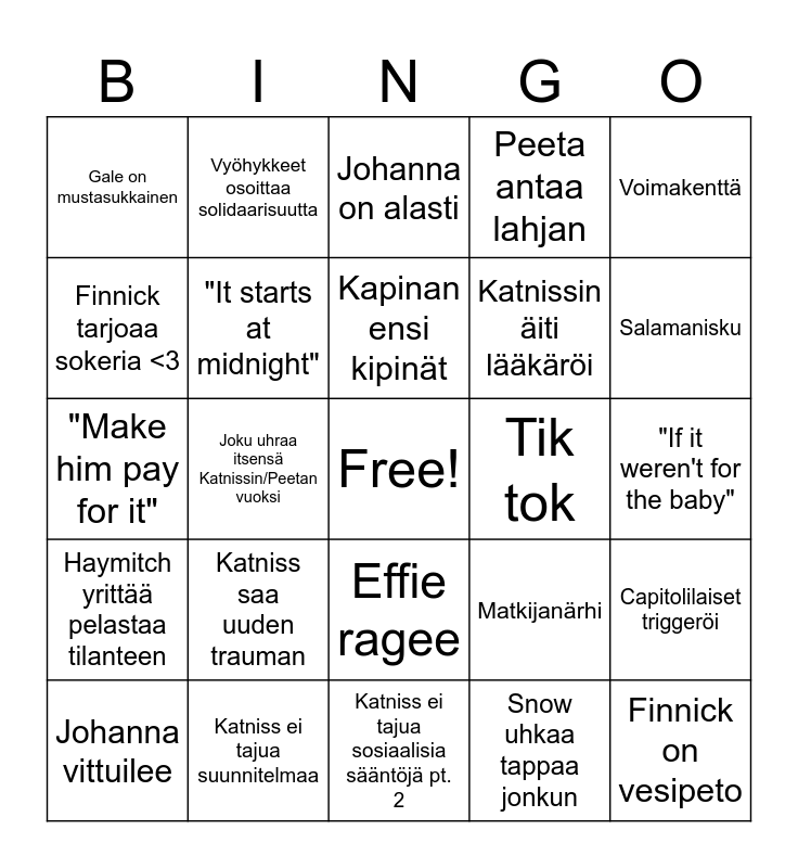 This bingo card has a free space and 24 words: Katniss saa uuden trauman, Katniss ei tajua suunnitelmaa, Kapinan ensi kipinät, Johanna vittuilee, Voimakenttä, Gale on mustasukkainen, Finnick tarjoaa sokeria <3, Vyöhykkeet osoittaa solidaarisuutta, Tik tok, Effie ragee, Katnissin äiti lääkäröi, "Make him pay for it", Matkijanärhi, Capitolilaiset triggeröi, "It starts at midnight", Snow uhkaa tappaa jonkun, "If it weren't for the baby", Johanna on alasti, Salamanisku, Joku uhraa itsensä Katnissin/Peetan vuoksi, Finnick on vesipeto, Haymitch yrittää pelastaa tilanteen, Peeta antaa lahjan and Katniss ei tajua sosiaalisia sääntöjä pt. 2.