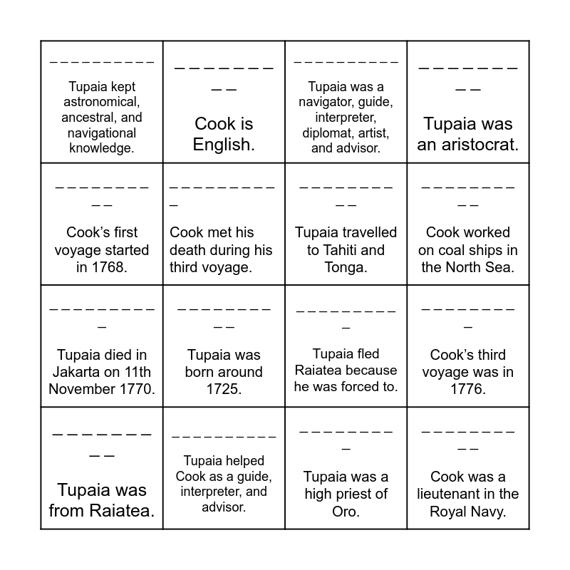 This bingo card has 16 words: _ _ _ _ _ _ _ _ _ _ Tupaia helped Cook as a guide, interpreter, and advisor., _ _ _ _ _ _ _ _ _ Cook’s third voyage was in 1776., _ _ _ _ _ _ _ _ _ _ Tupaia was a navigator, guide, interpreter, diplomat, artist, and advisor., _ _ _ _ _ _ _ _ _ _ Tupaia kept astronomical, ancestral, and navigational knowledge., _ _ _ _ _ _ _ _ _ _ Tupaia died in Jakarta on 11th November 1770., _ _ _ _ _ _ _ _ _ Cook is English., _ _ _ _ _ _ _ _ _ _ Tupaia fled Raiatea because he was forced to., _ _ _ _ _ _ _ _ _ Tupaia was a high priest of Oro., _ _ _ _ _ _ _ _ _ _ Cook’s first voyage started in 1768., _ _ _ _ _ _ _ _ _ _ Cook met his death during his third voyage., _ _ _ _ _ _ _ _ _ Tupaia was from Raiatea., _ _ _ _ _ _ _ _ _ Tupaia was an aristocrat., _ _ _ _ _ _ _ _ _ _ Tupaia was born around 1725., _ _ _ _ _ _ _ _ _ _ Cook worked on coal ships in the North Sea., _ _ _ _ _ _ _ _ _ _ Tupaia travelled to Tahiti and Tonga. and _ _ _ _ _ _ _ _ _ _ Cook was a lieutenant in the Royal Navy..
