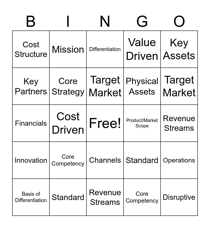 This bingo card has a free space and 25 words: Core Competency, Revenue Streams, Target Market, Basis of Differentiation, Key Assets, Cost Structure, Key Partners, Mission, Product/Market Scope, Channels, Physical Assets, Financials, Standard, Operations, Core Strategy, Human Assets, Revenue Streams, Differentiation, Target Market, Cost Driven, Disruptive, Standard, Innovation, Value Driven and Core Competency.