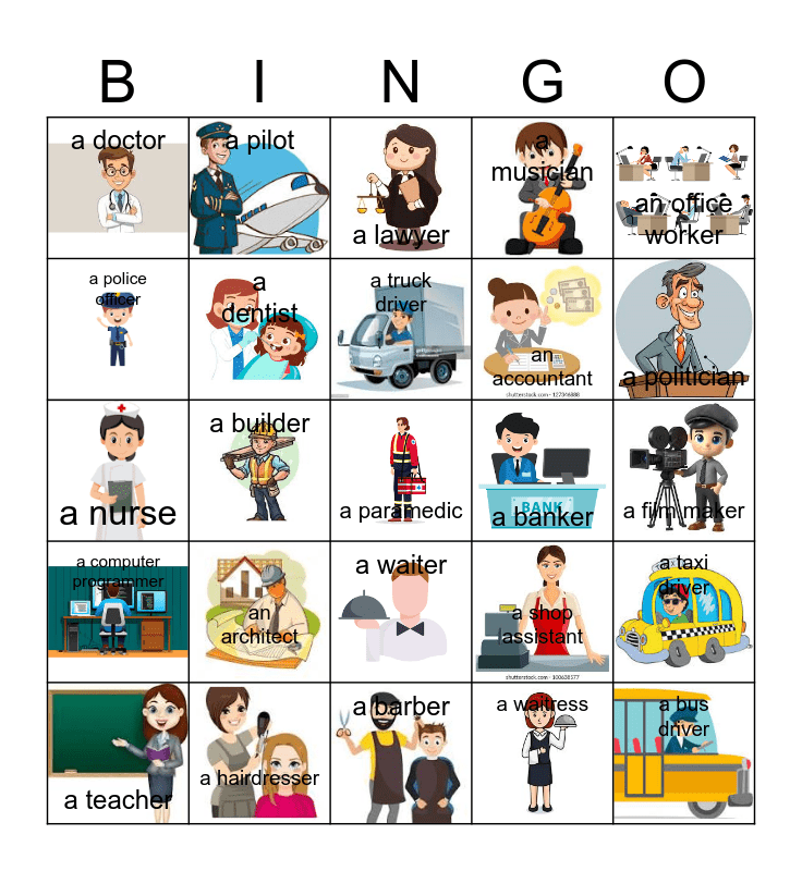 This bingo card has 24 images, a free space and 24 words: an architect, a hairdresser, a truck driver, a teacher, an office worker, a doctor, a police officer, a pilot, a banker, a waiter, an accountant, a nurse, a shop assistant, a taxi driver, a dentist, a waitress, a film maker, a lawyer, a politician, a builder, a bus driver, a computer programmer, a musician and a barber.