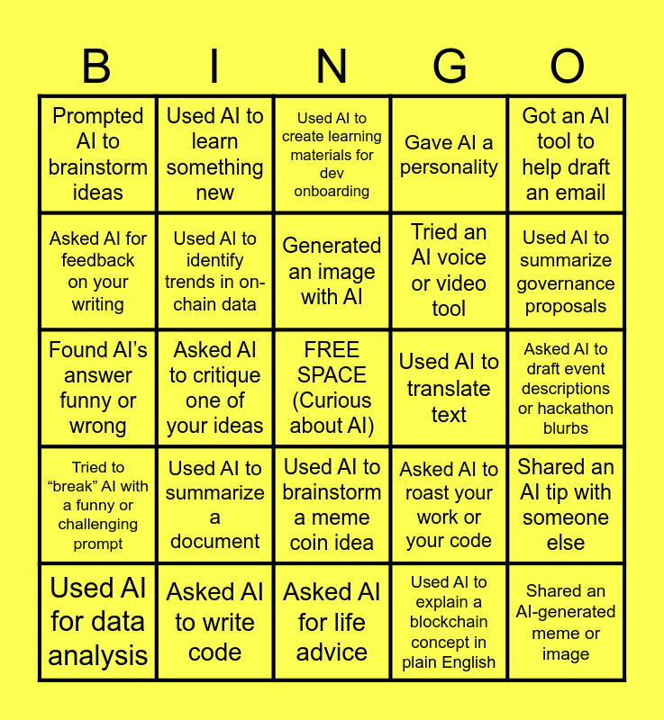 This bingo card has a free space and 24 words: Used AI to summarize a document, Asked AI to write code, Generated an image with AI, Used AI for data analysis, Got an AI tool to help draft an email, Prompted AI to brainstorm ideas, Asked AI for feedback on your writing, Used AI to learn something new, Used AI to translate text, Used AI to brainstorm a meme coin idea, Tried an AI voice or video tool, Found AI’s answer funny or wrong, Asked AI to roast your work or your code, Shared an AI tip with someone else, Used AI to identify trends in on-chain data, Used AI to explain a blockchain concept in plain English, Asked AI to draft event descriptions or hackathon blurbs, Used AI to create learning materials for dev onboarding, Used AI to summarize governance proposals, Asked AI to critique one of your ideas, Shared an AI-generated meme or image, Tried to “break” AI with a funny or challenging prompt, Gave AI a personality and Asked AI for life advice.