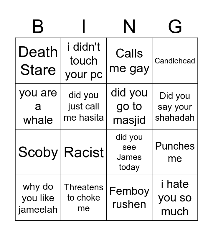 This bingo card has 16 words: Threatens to choke me, Punches me, Calls me gay, Death Stare, Scoby, i didn't touch your pc, did you see James today, Femboy rushen, you are a whale, did you just call me hasita, why do you like jameelah, Candlehead, Racist, Did you say your shahadah, did you go to masjid and i hate you so much.