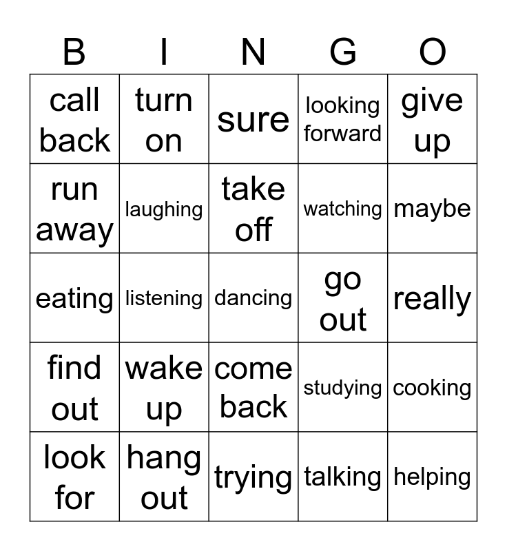 This bingo card has a free space and 24 words: wake up, hang out, take off, look for, give up, call back, run away, turn on, go out, come back, watching, eating, studying, cooking, laughing, talking, really, sure, maybe, listening, helping, find out, looking forward and trying.