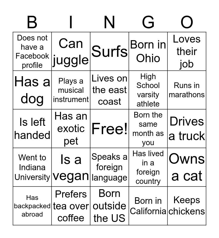 This bingo card has a free space and 24 words: Is a vegan, Prefers tea over coffee, Lives on the east coast, Has backpacked abroad, Loves their job, Does not have a Facebook profile, Has a dog, Can juggle, Born the same month as you, Speaks a foreign language, High School varsity athlete, Is left handed, Has lived in a foreign country, Owns a cat, Plays a musical instrument, Born in California, Drives a truck, Surfs, Runs in marathons, Has an exotic pet, Keeps chickens, Went to Indiana University, Born in Ohio and Born outside the US.