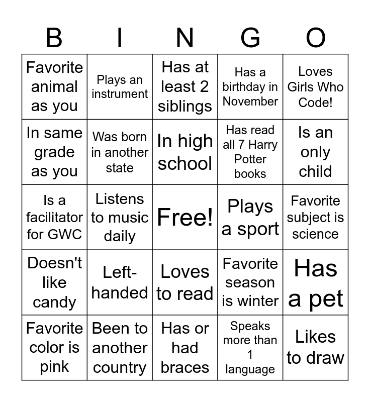 This bingo card has a free space and 24 words: Left-handed, Been to another country, In high school, Favorite color is pink, Loves Girls Who Code!, Favorite animal as you, In same grade as you, Plays an instrument, Plays a sport, Loves to read, Has read all 7 Harry Potter books, Is a facilitator for GWC, Favorite season is winter, Has a pet, Was born in another state, Speaks more than 1 language, Favorite subject is science, Has at least 2 siblings, Is an only child, Listens to music daily, Likes to draw, Doesn't like candy, Has a birthday in November and Has or had braces.