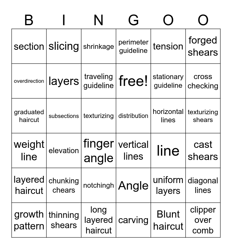 This bingo card has 36 words: Angle, notchingh, carving, overdirection, weight line, distribution, layers, long layered haircut, tension, uniform layers, cross checking, perimeter guideline, diagonal lines, subsections, free!, section, layered haircut, horizontal lines, graduated haircut, shrinkage, texturizing, elevation, vertical lines, finger angle, line, slicing, stationary guideline, thinning shears, traveling guideline, forged shears, clipper over comb, growth pattern, cast shears, texturizing shears, chunking chears and Blunt haircut.