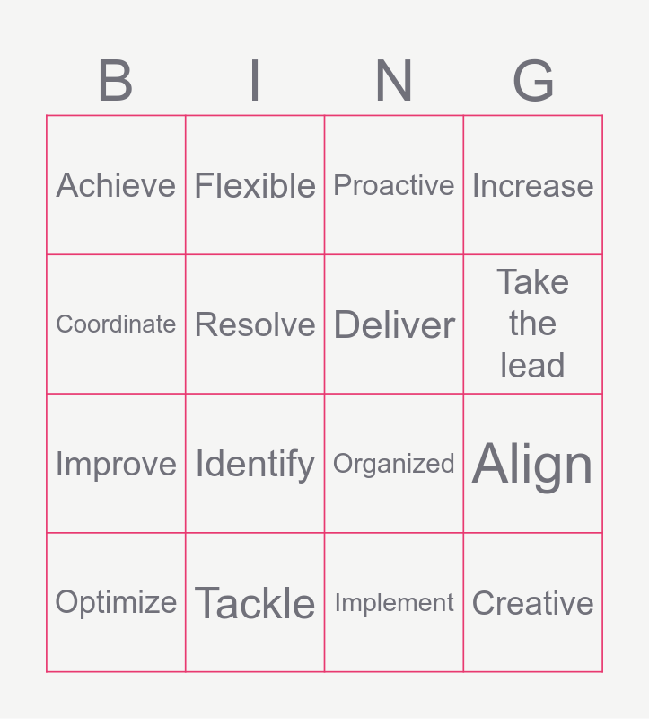This bingo card has 16 words: Tackle, Align, Proactive, Achieve, Improve, Flexible, Organized, Implement, Coordinate, Resolve, Optimize, Increase, Identify, Take the lead, Deliver and Creative.