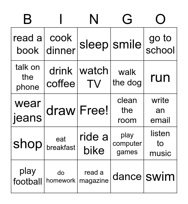 This bingo card has a free space and 24 words: eat breakfast, do homework, watch TV, play football, go to school, read a book, talk on the phone, cook dinner, clean the room, ride a bike, walk the dog, wear jeans, play computer games, listen to music, drink coffee, dance, write an email, sleep, run, draw, swim, shop, smile and read a magazine.