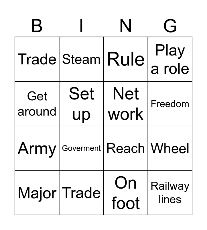 This bingo card has 16 words: Trade, Wheel, Rule, Trade, Army, Steam, Reach, On foot, Get around, Set up, Major, Play a role, Goverment, Freedom, Net work and Railway lines.