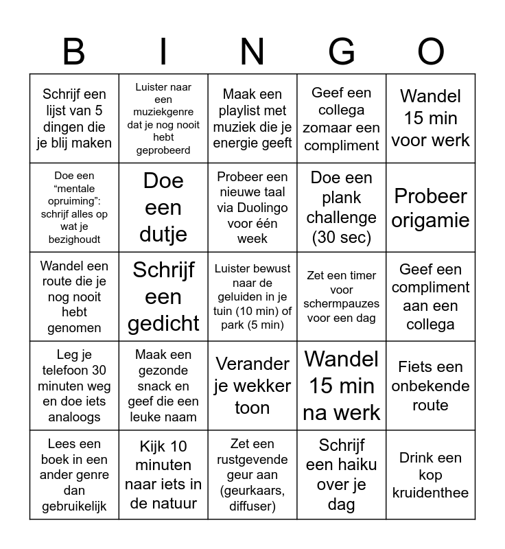 This bingo card has 100 words: Ruim je rommellade op, Organiseer een mini-wandeling met collega’s, Geef een compliment aan een collega, Doe een dansje op je favoriete nummer, Drink 2 glazen water extra vandaag, Doe een korte workout (bijv. via YouTube), Probeer een nieuw (vegetarisch) recept, Lach bewust (bijvoorbeeld door een grappig filmpje te kijken), Lees een inspirerend artikel of boek, Mediteer 10 minuten, Zet 10000 stappen op één dag, Bel iemand die je lang niet hebt gesproken, Doe een kruiswoordpuzzel of een sudoku, Kijk 10 minuten naar iets in de natuur, Doe een creatieve oefening (tekenen, kleuren), Probeer een nieuwe taal (1 woord leren), Doe een plank challenge (30 sec), Probeer een koude douche, Doe een wall sit van 1 minuut, Probeer een recept uit een ander land, Deel een inspirerende quote, Deel een grappige meme, Vraag iemand naar hun favoriete muziek, Deel een podcasttip, Deel een recept, Zet een timer voor schermpauzes voor een dag, Wandel 15 min voor werk, Wandel 15 min na werk, Bekijk een video over mindfulness, Werk een half uur staand (op kantoor), Schrijf een gedicht, Schrijf een lijst van 5 dingen die je blij maken, Drink een dag alleen water, Geef iemand een kaartje, Schrijf een haiku over je dag, Probeer een nieuwe taal via Duolingo voor één week, Fiets een onbekende route, Doe een stretchsessie voor je polsen, Zing in volle borst mee met je favoriete nummer, Drink een kop kruidenthee, Doe 10 jumping jacks tussen vergaderingen, Doe een mini-danswedstrijd met een collega, Wandel een route die je nog nooit hebt genomen, Teken iets zonder doel, gewoon voor ontspanning, Probeer origamie, Maak een playlist met muziek die je energie geeft, Lees een hoofdstuk uit een boek dat al lang ligt te wachten, Eet een maaltijd zonder afleiding, Organiseer een virtuele koffiepauze met een collega, Zet een rustgevende geur aan (geurkaars, diffuser), Eet een dag geen vlees, Ga met de fiets boodschappen doen, Begin de dag met een dansje, Proef iets nieuws, Een dag zonder social media, Maak een wandeling in de regen, (Op kantoor) met de trap naar de kantine, Wandel 15 min onder werktijd, Deel een succes op het dagstartbord, Geef een collega zomaar een compliment, Luister een heel muziek album in één zit, zonder afleiding, Schrijf 5 dingen waar je dankbaar voor bent, Besteed je Time2Grow Budget., Ontdek een nieuw gedeelte van je stad/van een stad in de buurt., Probeer een YouTube-video met tai chi, Doe een huishoudelijke taak als beweging (bijv. ramen lappen), Drink een dag geen koffie, Loop een paar rondjes door je huis tijdens het bellen, Probeer een recept met een onbekend kruid of specerij, Maak een lijst van 10 dingen die je ooit nog wilt doen, Probeer een nieuwe sport / fysieke activiteit, Maak een gezonde snack en geef die een leuke naam, Zoek een nieuwe Hobby, Zet een plant op een nieuwe plek en geef extra water, Beoefen je hobby voor 2 uur., Zoek een onderwerp waar je meer over wilt weten, en leer hier iets over., Volg een ademhalingstutorial op youtube, Doe een “mentale opruiming”: schrijf alles op wat je bezighoudt, Maak een lijst van kleine klusjes en vink er één af, Zet een geurverspreider aan met een nieuwe geur, Werk een uur zonder notificaties of afleiding, Luister bewust naar de geluiden in je tuin (10 min) of park (5 min), Observeer insecten of vogels en maak een foto, Verander je wekker toon, Vraag 3 collega's om hun favoriete nummer, en luister ernaar, Luister naar een muziekgenre dat je nog nooit hebt geprobeerd, Zet een alarm voor je bedtijd (niet alleen voor opstaan), Verander je bureaubladachtergrond naar iets rustgevends, Ruim je koelkast op, Leg je telefoon 30 minuten weg en doe iets analoogs, Deel een compliment via een post-it op iemands bureau, Doe iets waar je trots op bent., Ga 2 dagen achter elkaar vroeger naar bed dan normaal, Lees een boek in een ander genre dan gebruikelijk, Doe een dutje, Een week geen alcohol, Kijk een TED Talk, Werk je To-Do lijst helemaal af., Spreek uit waar jij stress van ervaart and Lunch op een werkdag in de buitenlucht.