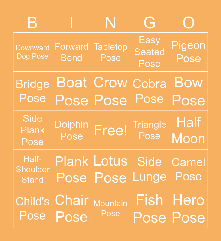 This bingo card has a free space and 24 words: Plank Pose, Chair Pose, Crow Pose, Child's Pose, Pigeon Pose, Downward Dog Pose, Bridge Pose, Forward Bend, Triangle Pose, Lotus Pose, Cobra Pose, Side Plank Pose, Side Lunge, Camel Pose, Boat Pose, Fish Pose, Half Moon, Tabletop Pose, Bow Pose, Dolphin Pose, Hero Pose, Half-Shoulder Stand, Easy Seated Pose and Mountain Pose.
