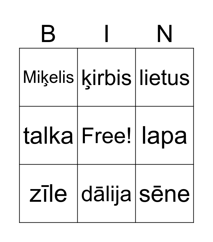 This bingo card has a free space and 8 words: lapa, lietus, ķirbis, zīle, Miķelis, sēne, talka and dālija.